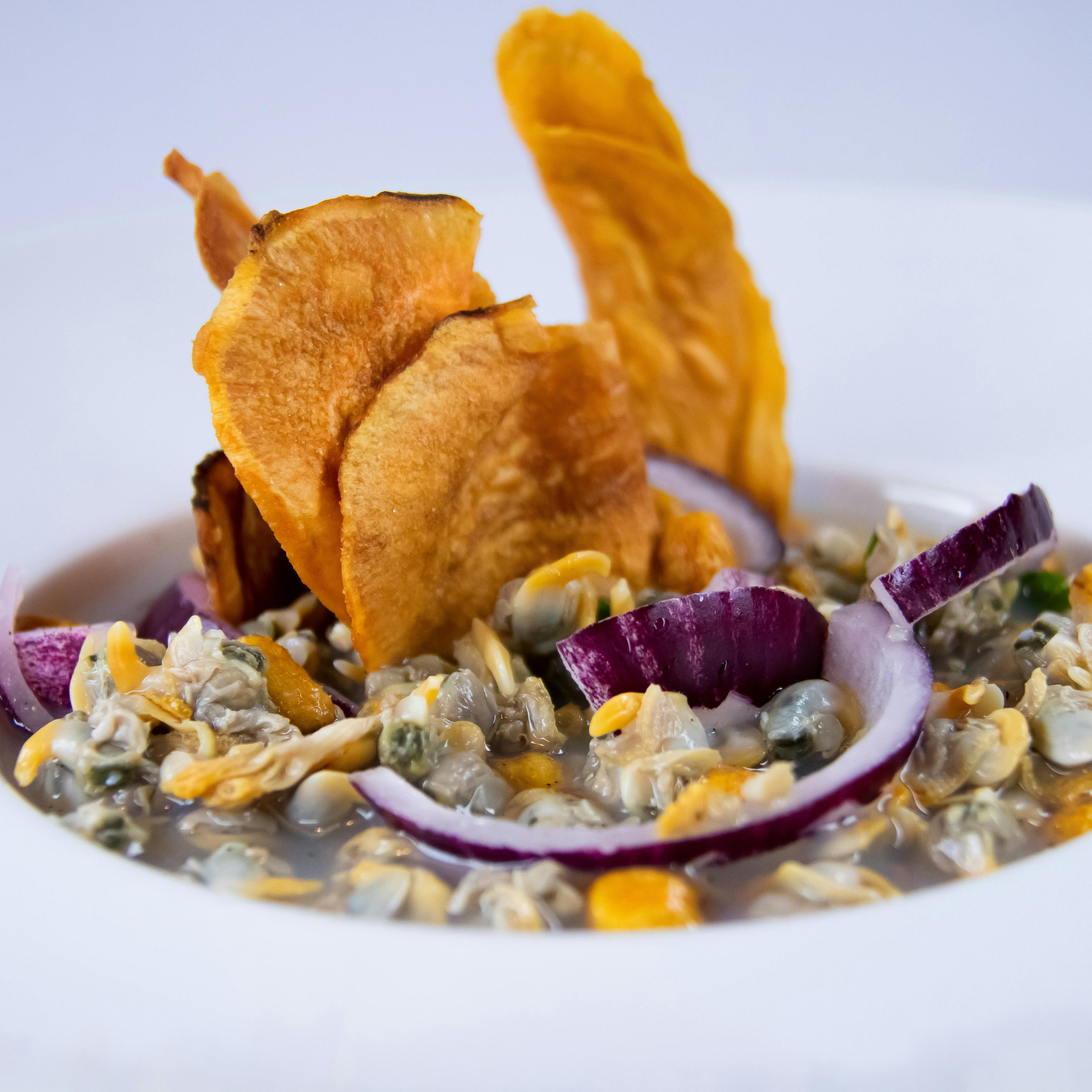 Tender clams marinated in lime, ginger, and Scotch bonnet heat, mixed with mango, cilantro, and crisp peppers.