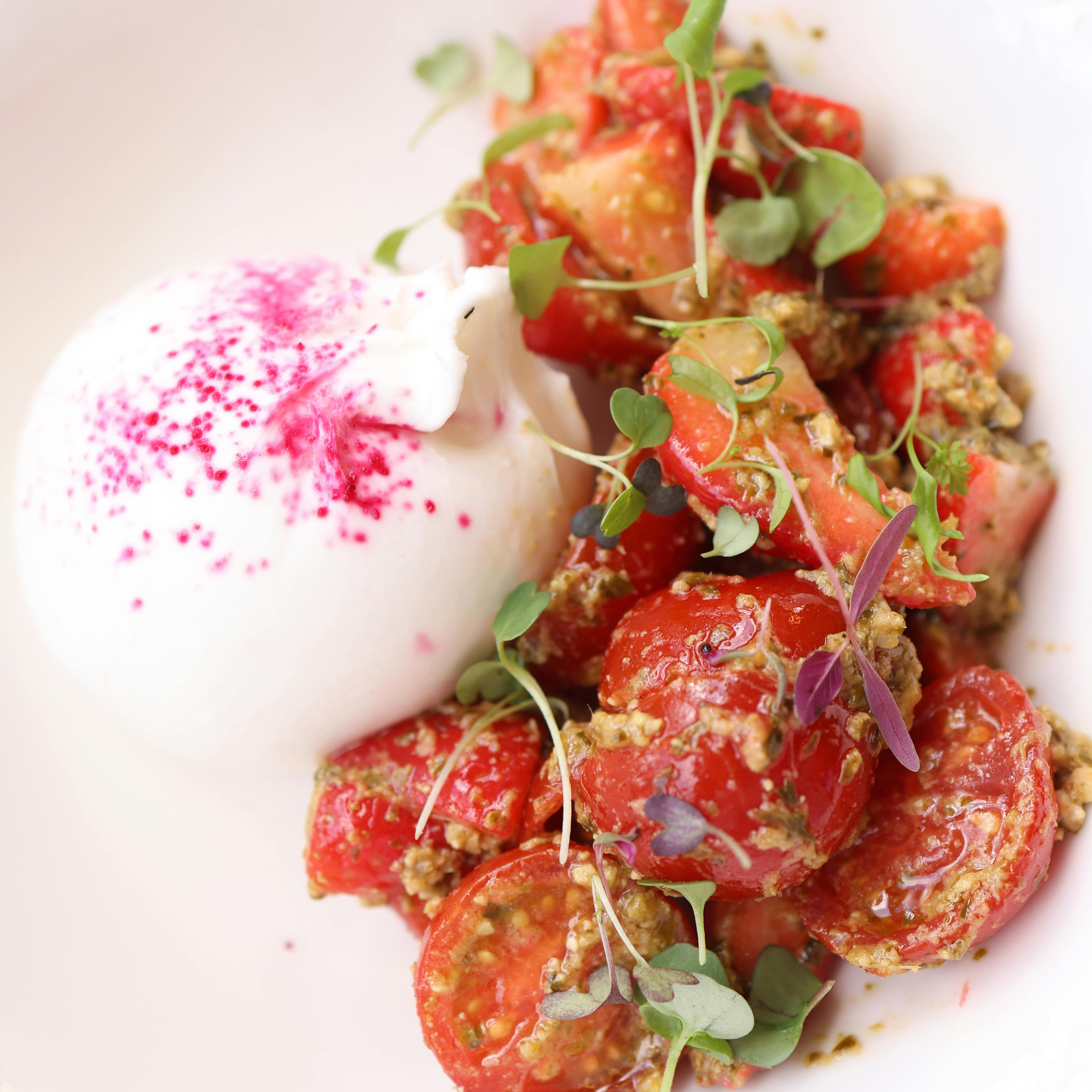 Vine-ripened tomatoes tossed with citrus, fresh herbs, Scotch bonnet-lime dressing, and a dollop of fresh crema.