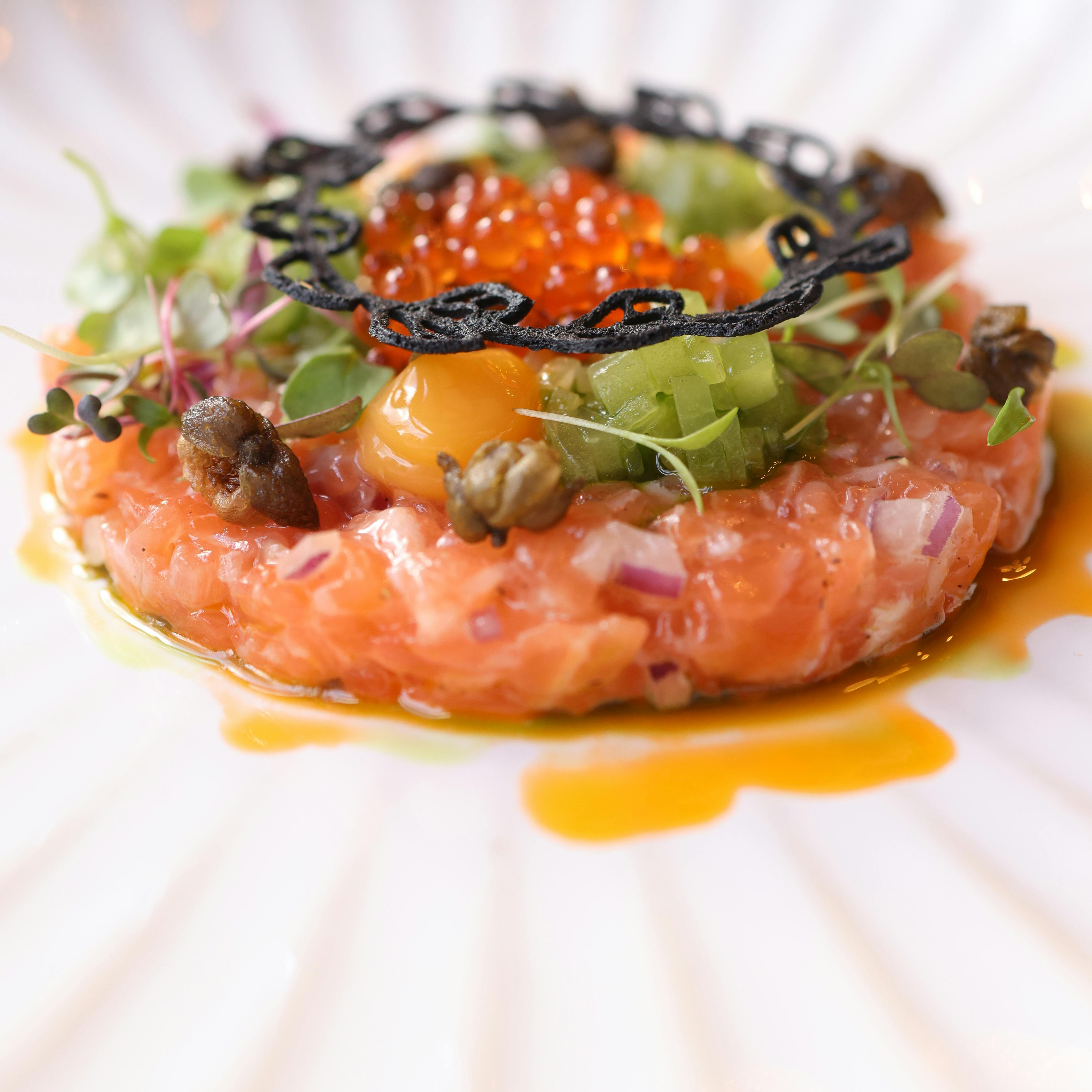 A silky pillow of diced tuna tossed with lime, ginger, and Scotch bonnet heat, topped with mango and avocado.